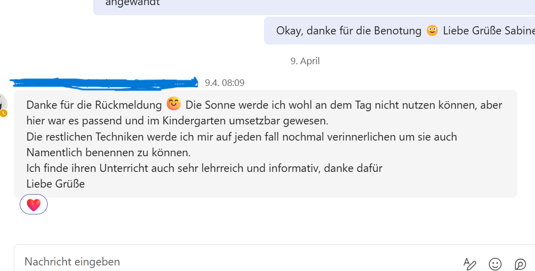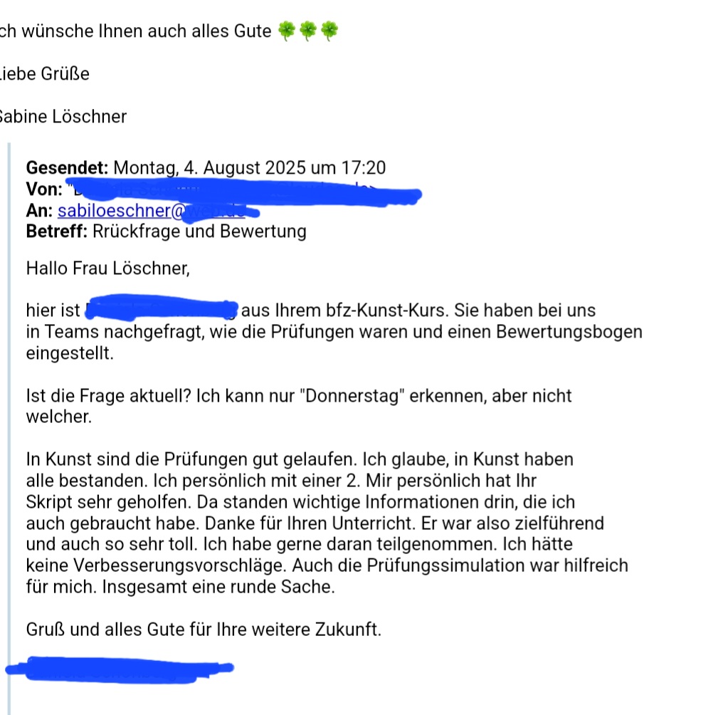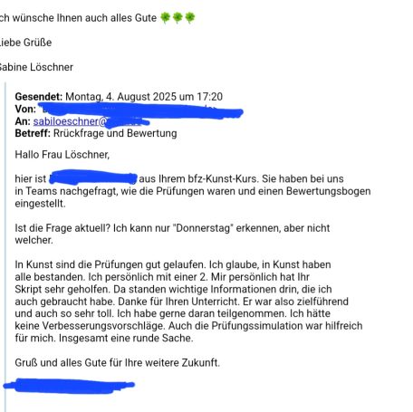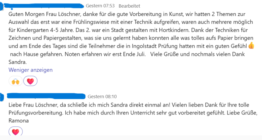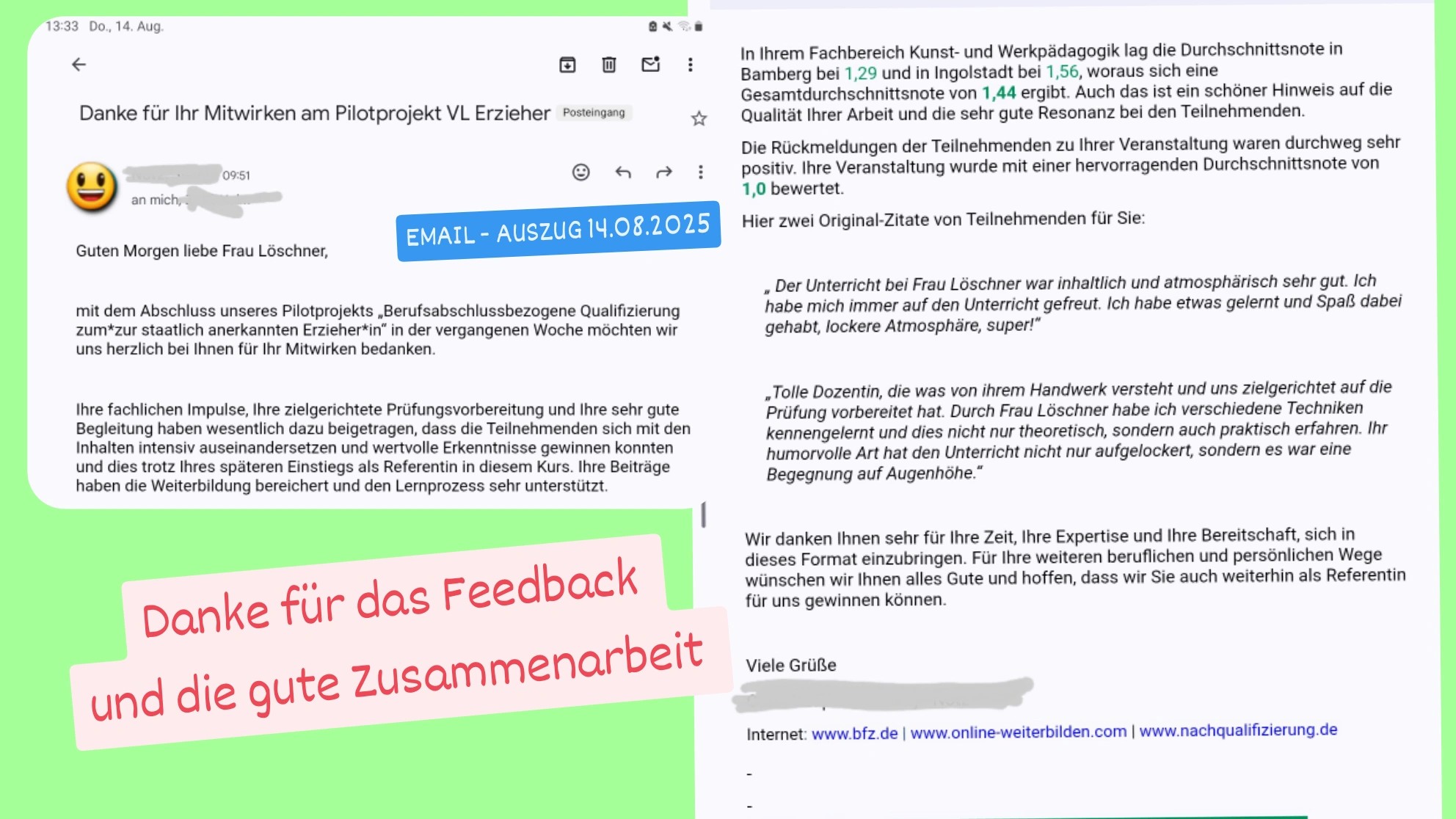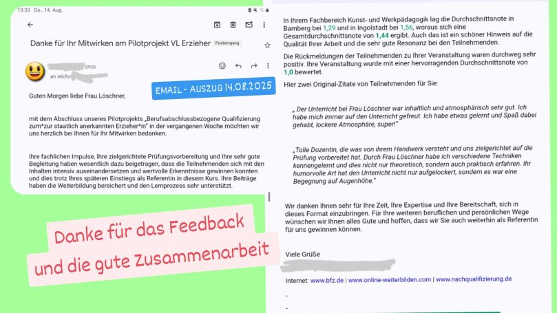 Das ist nur ein Teil der Feedbacks aus meiner Tätigkeit als Dozentin in mehreren Bildungswerken in den Bereichen prüfungsbegleitende Maßnahmen für Kinderpflegepersonen für Externenprüfungen, in den Fächern Werkerziehung und Gestaltung und Säuglingsbetreuung.